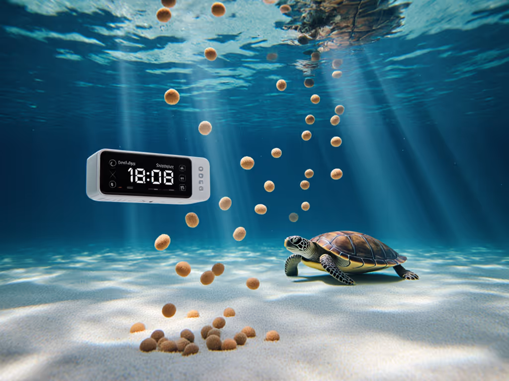 Turtles also eat 2-5 times less frequently than fish but require larger, protein-rich meals. A fish feeder's tiny daily portions leave turtles hungry, while their 4x per day schedule forces unnatural grazing. Remember: turtles aren't just scaled fish. Their biology demands tools respecting their pace.